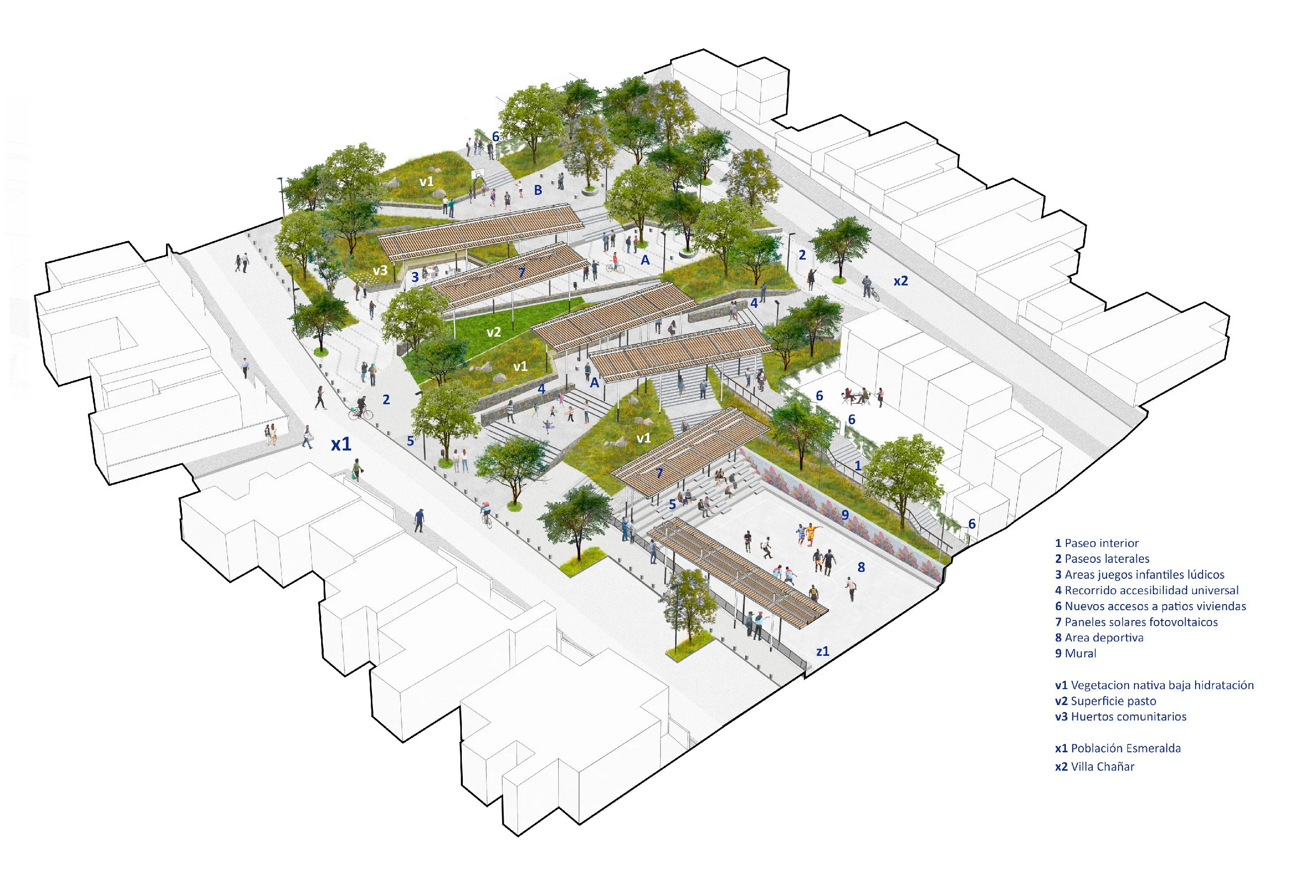 El diseño se articula a partir de una pregunta central: ¿cómo generar la mayor percepción de verde con la menor superficie vegetal posible en un territorio de extrema escasez hídrica? A partir de una lectura atenta del lugar, se disponen bosquetes estratégicos en los remates visuales de los pasajes del barrio, permitiendo que cada vecino acceda desde su calle a una imagen verde. Estos bosquetes operan como espacios de circulación, sombra, encuentro y huertas comunitarias, recomponiendo vínculos entre sectores históricamente separados por el vertedero.