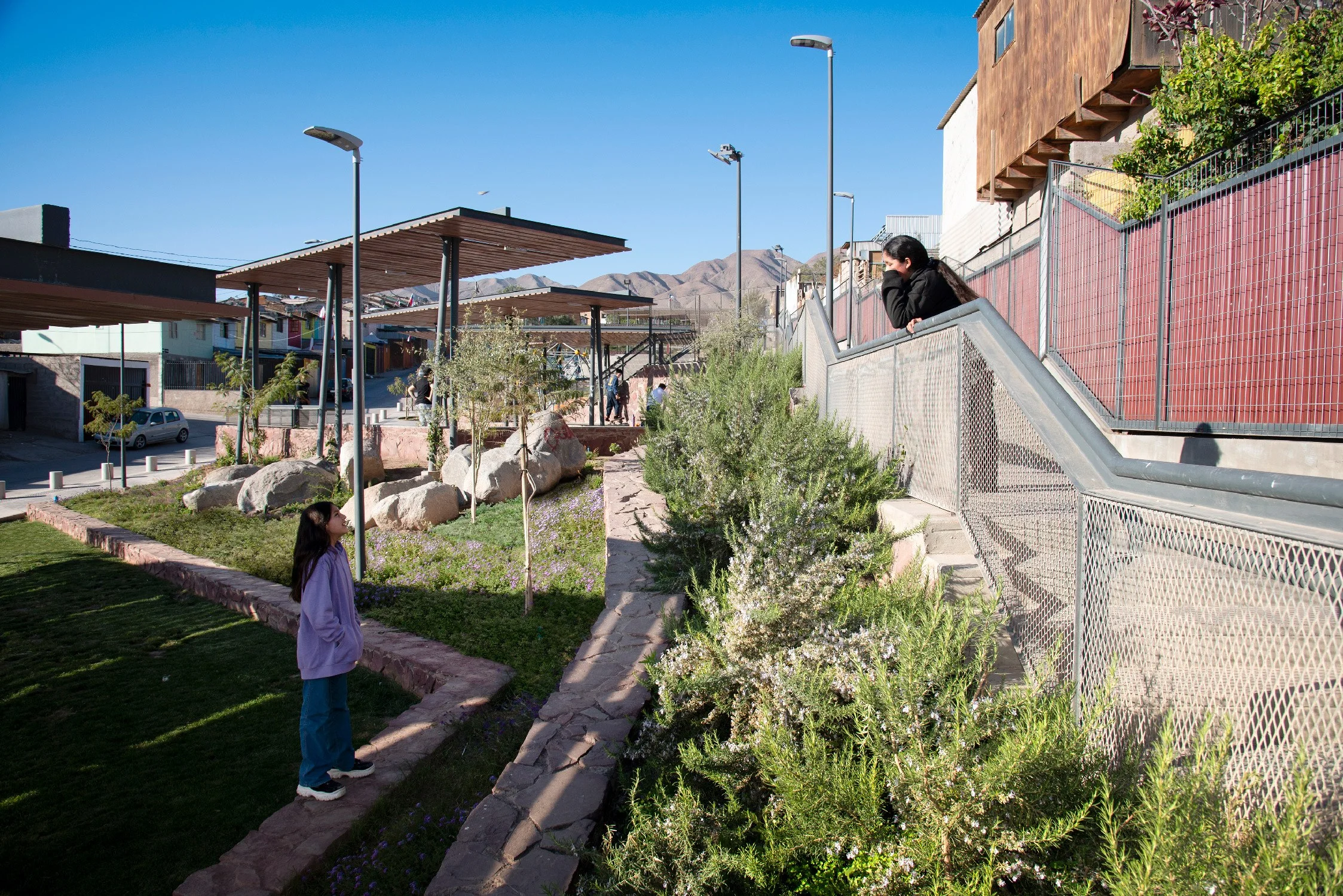 La pronunciada topografía del terreno, con un desnivel cercano a los 42 metros, se aborda mediante un sistema de terrazas sucesivas contenidas por pircas de piedra construidas por canteros locales. Este gesto estabiliza el terreno, incorpora un oficio tradicional y genera miradores hacia el valle de Copiapó, articulando una diversidad de escalas y usos: plazas menores, corredores sombreados, zonas de juego, espacios comunitarios y rutas de ascenso accesible, convirtiendo la pendiente en una experiencia espacial.